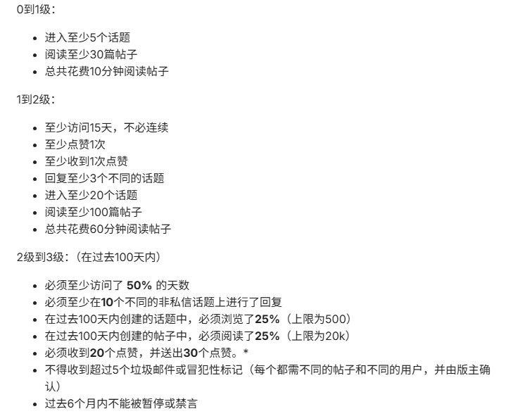 虽然福利多,但有的福利必须要论坛等级达标才能使用,比如刚刚的公益机场,只有论坛等级达到LV2才能注册使用,下面是LinuxDo社区升级的相关规则