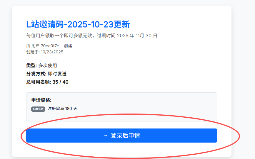 点击登录并申请(需要一个注册满180天的Github账号登录),若没有名额了,可以看一看其他的链接,或者看评论区有没有新的链接,申请成功后复制邀请码即可