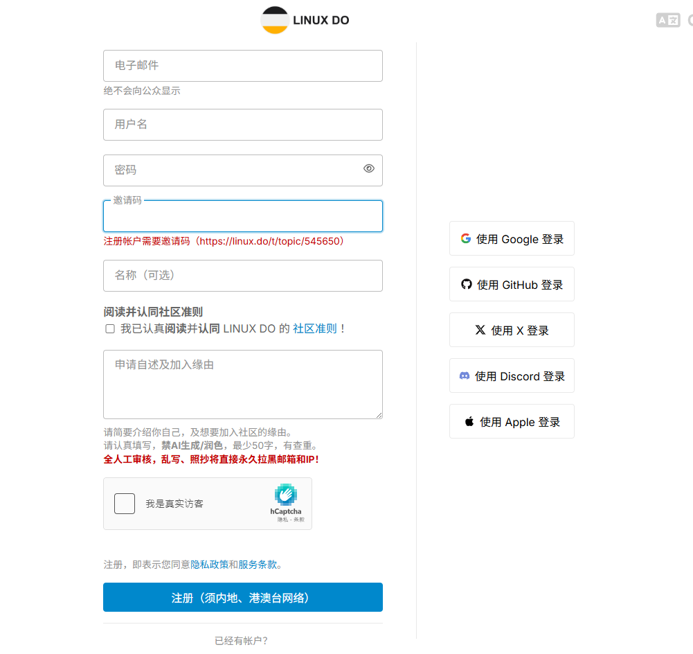因为linux do社区拒绝网络戾气入侵,所以必须要使用别人的邀请码才能注册