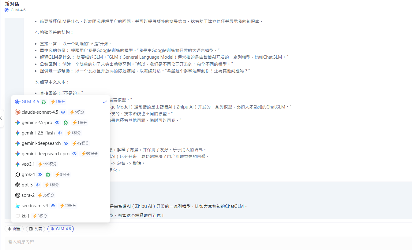 在对话页面可以自己选择模型,每个模型每次回复所需的积分都有标注